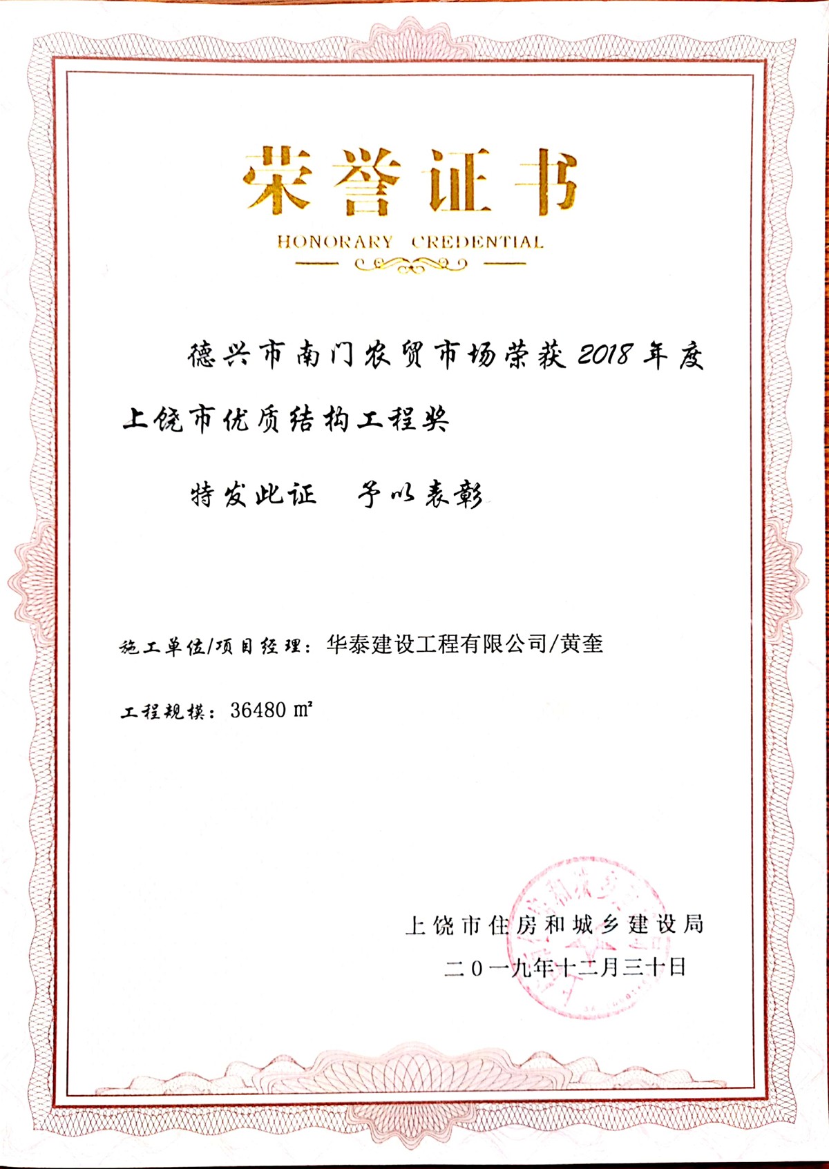 日前,由華泰建設(shè)工程有限公司承建的上饒德興南門農(nóng)貿(mào)市場項目,榮獲了上饒市住房和城鄉(xiāng)建設(shè)局頒發(fā)的“2018年度上饒市優(yōu)質(zhì)結(jié)構(gòu)工程獎”。