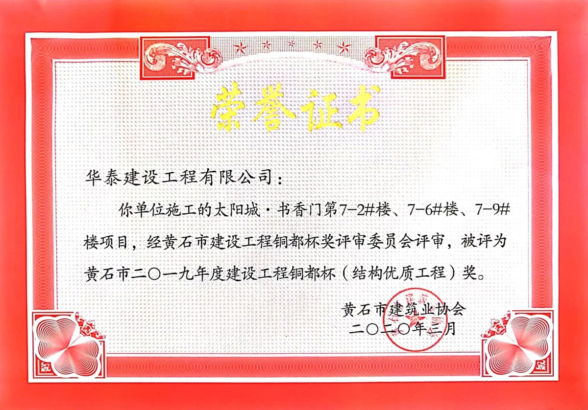 日前,由我司承建的太陽(yáng)城書香門第項(xiàng)目,被黃石市建筑業(yè)協(xié)會(huì)評(píng)為的“2019年度結(jié)構(gòu)優(yōu)質(zhì)工程獎(jiǎng)”。
