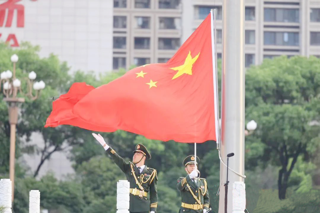 6點(diǎn)10分,在慷慨激昂的《中國人民解放軍進(jìn)行曲》中,英姿颯爽的國旗護(hù)衛(wèi)隊(duì)隊(duì)員踢著堅(jiān)實(shí)而雄健的步伐從候場區(qū)走過金水橋,精神抖擻地護(hù)送國旗走向升旗臺(tái)。隨后,雄壯的中華人民共和國國歌響起,升旗手振臂一揮,鮮艷的五星紅旗冉冉升起。華泰建設(shè)全體員工滿心激動(dòng),仰望國旗、高唱國歌,祝愿偉大祖國繁榮昌盛。